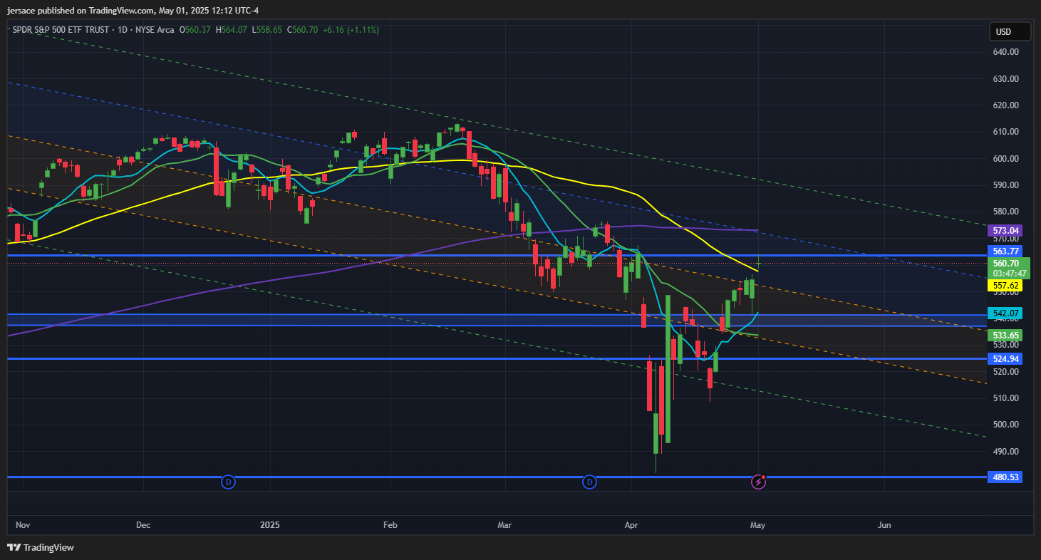 Trending in the right direction. The market extended their ‘winning streak’ today if you will. Major tech companies, including Microsoft and Meta, delivered quarterly results that beat expectations, helping to lift sentiment across the market. Microsoft’s strong cloud performance and Meta’s robust revenue both contributed to today’s rally. The U.S. economy contracted in the first quarter, with GDP down at an annualized 0.3%-the first decline since early 2022. The drop was largely attributed to a surge in imports ahead of new tariffs and softer consumer spending. However, business investment remained strong, and analysts expect some of these negative effects to reverse in the coming quarter. We back-tested the 50DMA early on in the session where buyers stepped in to hold current marks. Traders will be looking for more positive news to drive the next move and continue this rally off April lows.