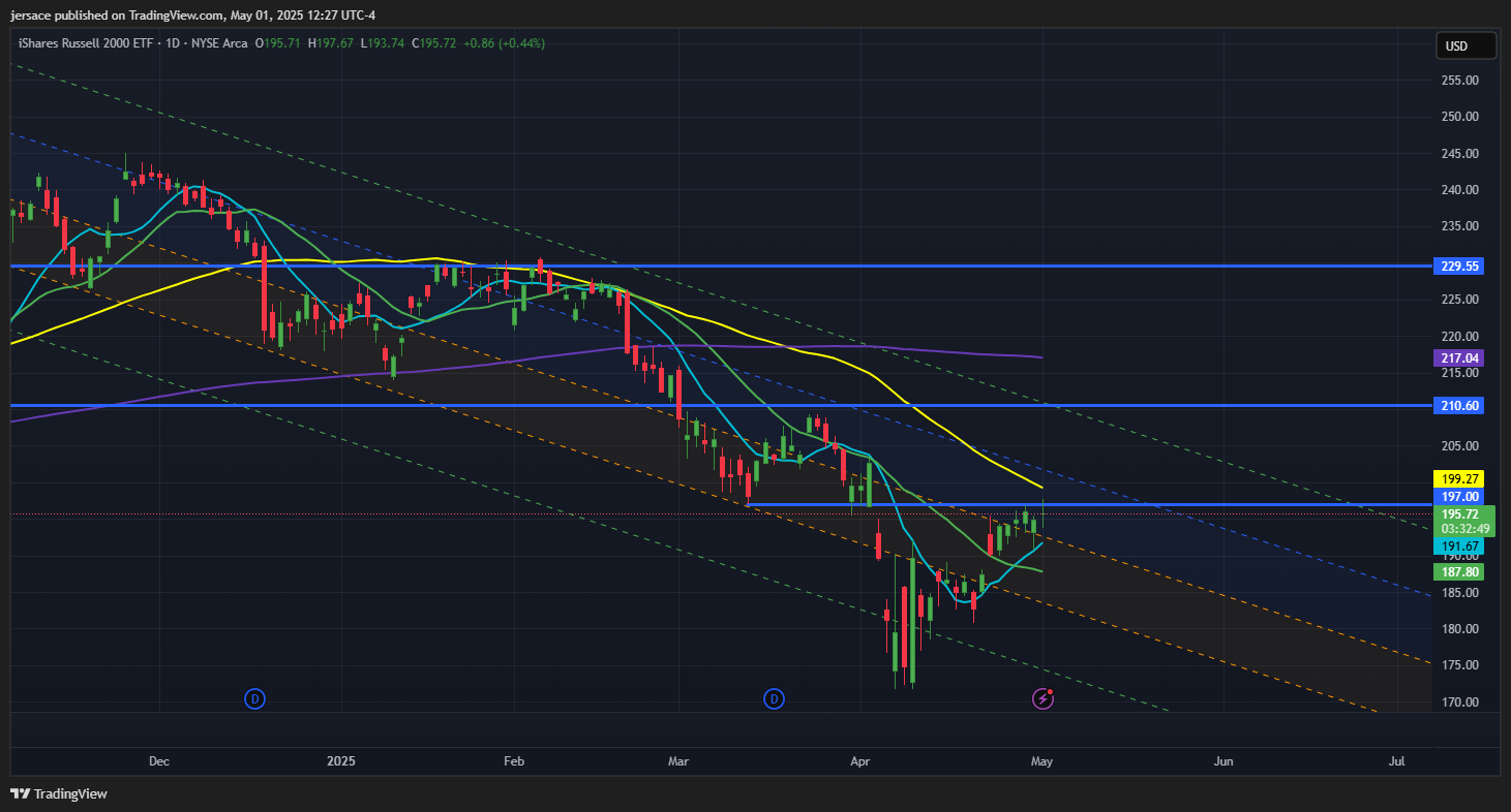 While large-cap tech stocks have dominated headlines, small caps have quietly stabilized after a volatile first quarter. IWM has managed to hold above recent lows, though it remains below its 50-day and 200-day moving averages, reflecting a cautious longer-term trend. The recent ability to hold above $190 is constructive, but a decisive move above $200 would be needed to confirm a new uptrend and attract more buyers.