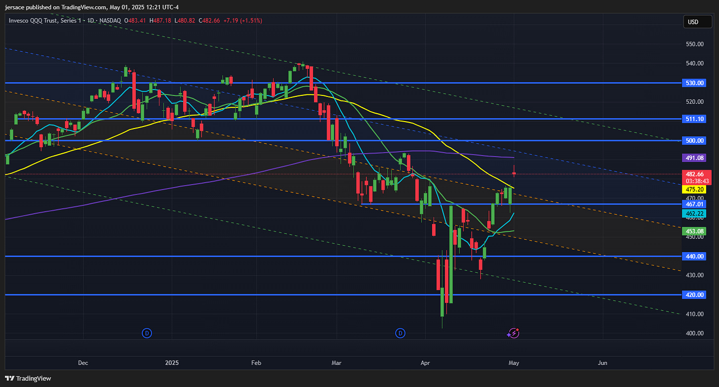 The rally was driven by strong earnings from major technology names and *allegedly* renewed optimism around U.S.-China trade talks. Microsoft reported higher-than-expected CapEx, signaling ongoing investment in AI infrastructure. Meta also raised its capital spending outlook, reinforcing the AI-driven growth narrative that had fueled tech stocks in 2024. Short-term indicators are positive, with QQQ holding above its 50-day average. However, the ETF is technically overbought, and the broader trend remains cautious after a volatile first quarter. We’ve got the 200DMA just overhead which brings cause for concern, yet with a few more major tech companies set to report in the coming days, we can see a push above this mark if they beat expectations.