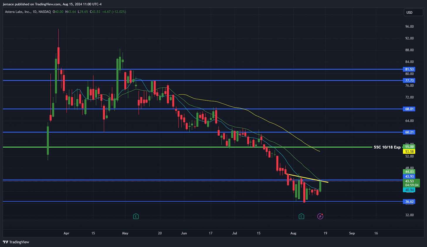 The chart is showing a resistance at 43.9 followed by another resistance at 45.6 which was a previous support in July. Additionally, the stock is trading above the 10EMA and testing the 20EMA which could be used as another resistance.