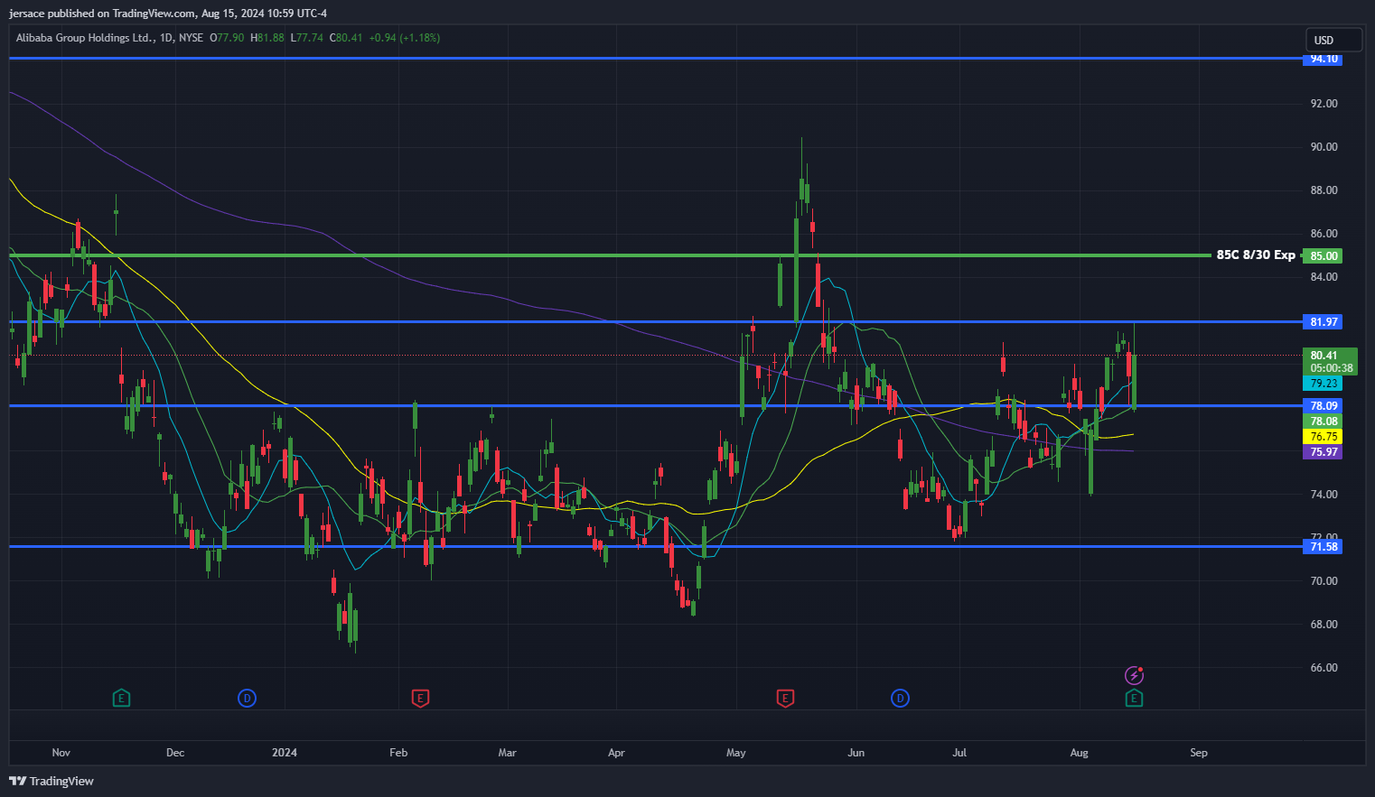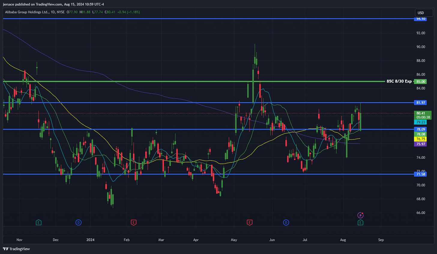 The chart is showing us a nice recovery since the 71.9 lows and an important test coming at the 82 - 82.3 resistance area. It is important to note that the stock reclaimed the 50 and 200 EMAs by trading above 77.55 and 78.28 respectively