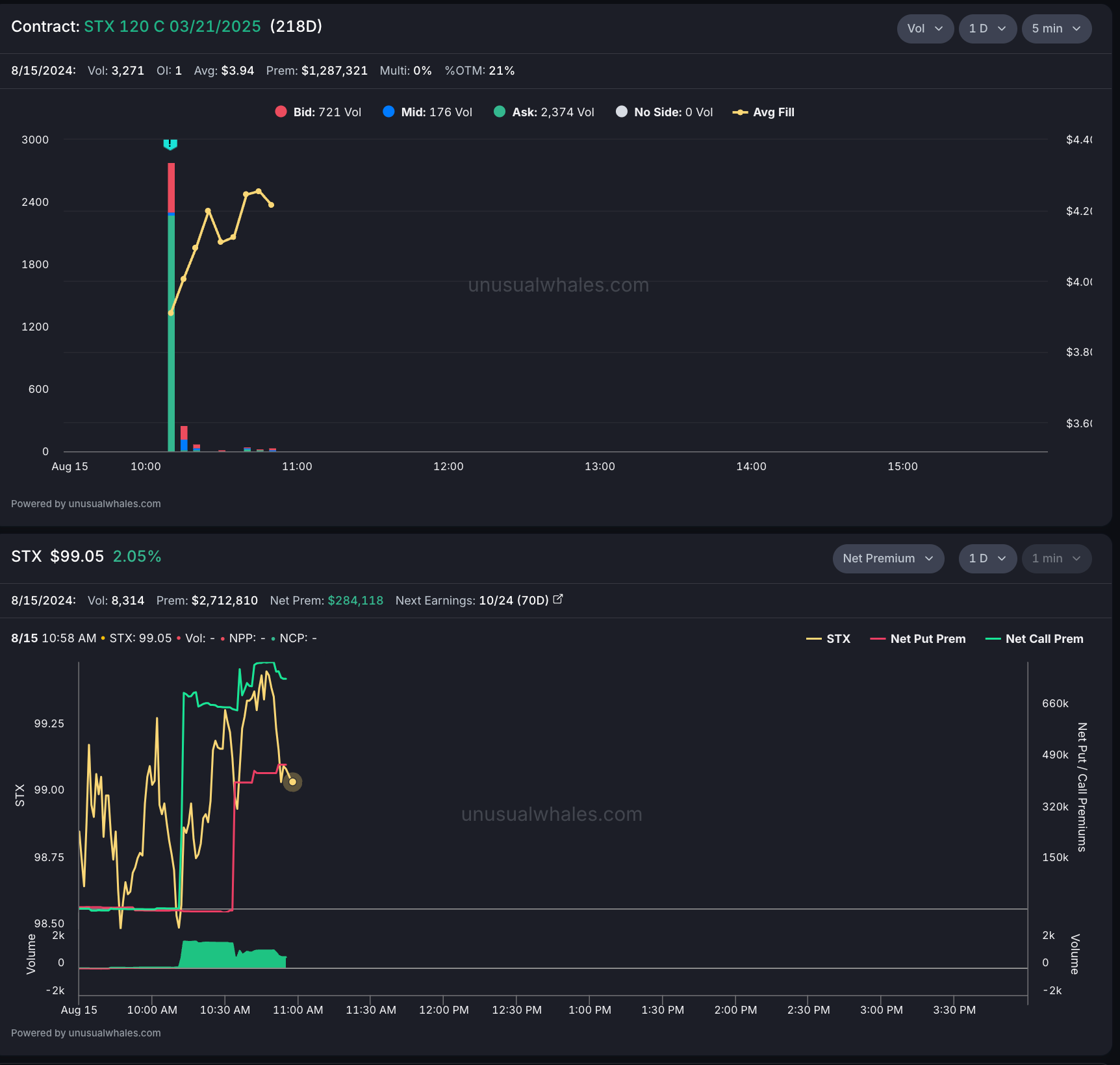 Whales are betting for more upside by adding longer-dated calls 21% OTM. This is a clean example of a BTO (buy to open) order, where we can see one big trade taking nearly all of the daily volume. OI was 1 meaning only 1 contract was being held before this trade. This number should be above 3k the following day assuming the OI sticks and carries overnight.