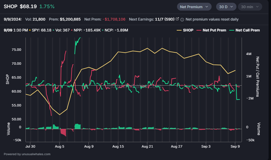 This Whale opened 3k contracts with a cost basis of $2 million on credit, making this a bearish trade. The chart below shows that the net call premium hit its lowest flows in the past 30 days at $1.9 million, while puts remained neutral.