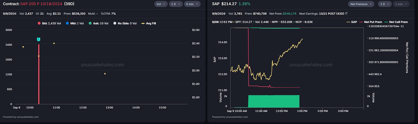 This Whale is placing a bullish bet by selling these puts. Almost 2.5k contracts were traded at the Bid within an hour of the market opening, causing a big decline in the put Net premium. This is the highest option volume that SAP 0.00%↑ has had in the past 30 days.