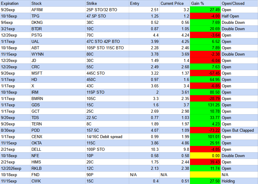 The standout performer was the $GDS 15C expiring on 1/17, which saw a remarkable 130% return. On the flip side, the $PDD 157.5C expiring on 8/30 experienced a 73% unrealized loss. Check out the details below
