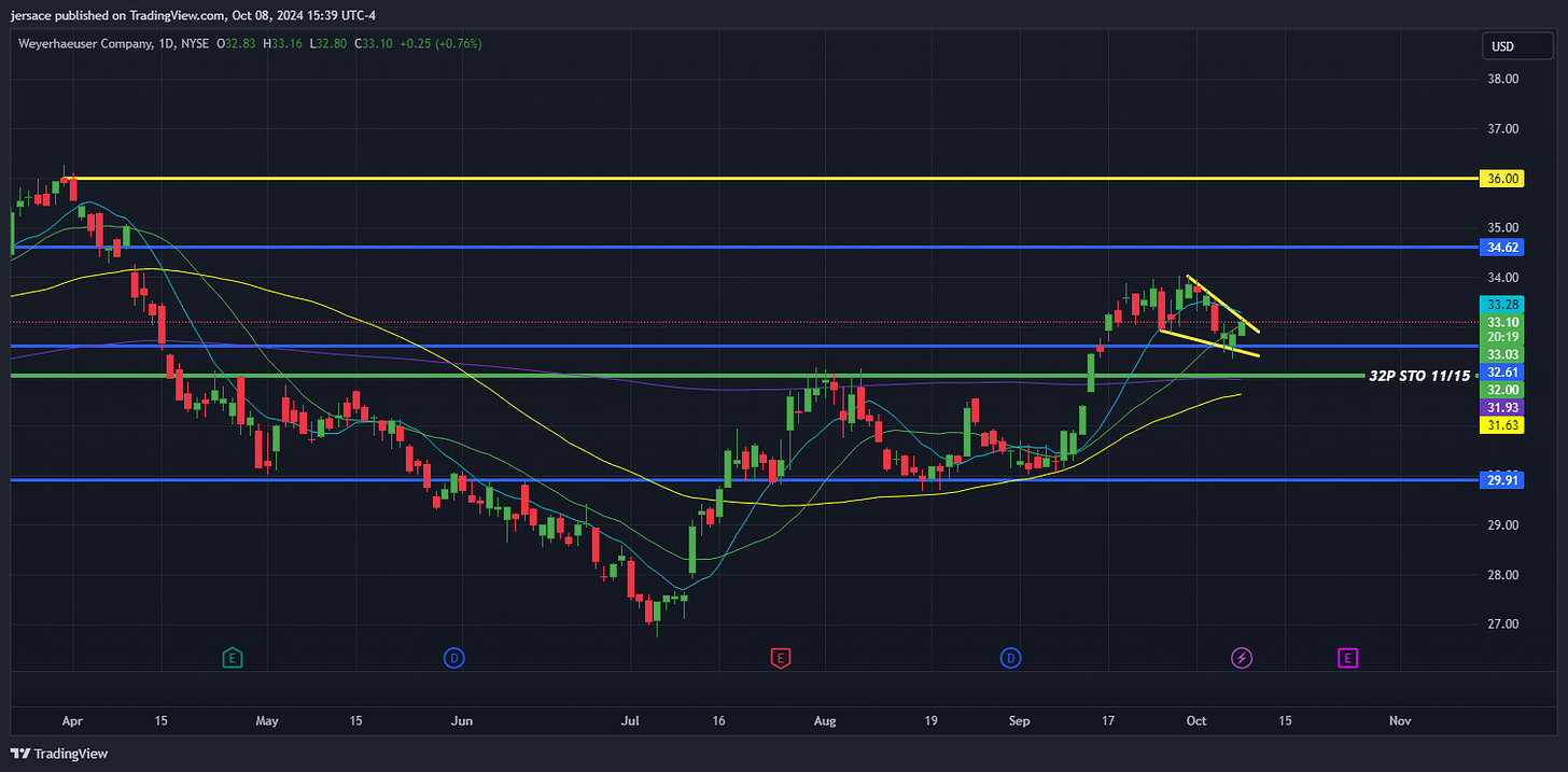 Slight wedge here into moving average’s, 10 above, 50 below. Break above the 10DMA would trigger further upside as WY found support at 32.61 which was previously resistance. This bodes well for future price action assuming the market cooperates alongside the upcoming CPI print. Have we made the joke about how this CPI print is the most important one of our lives yet? If we haven’t I apologize, it is. Womp womp, let’s go REIT’s.