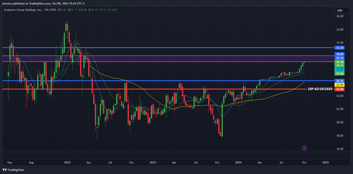 Financially, Endeavor has a negative net margin of -6.23% yet stable operating margins of 2.93%. In recent days, CEO Ariel Emanuel has sold shares which could indicate potential concerns about current stock valuation. The whale may have seen this and decided to take a stab at a short trade on the stock as it is up nearly 30% YTD. Shown on the chart is quite the supply zone which bodes well for bears. A rejection of this zone up here could trend the stock back towards mid-20’s.