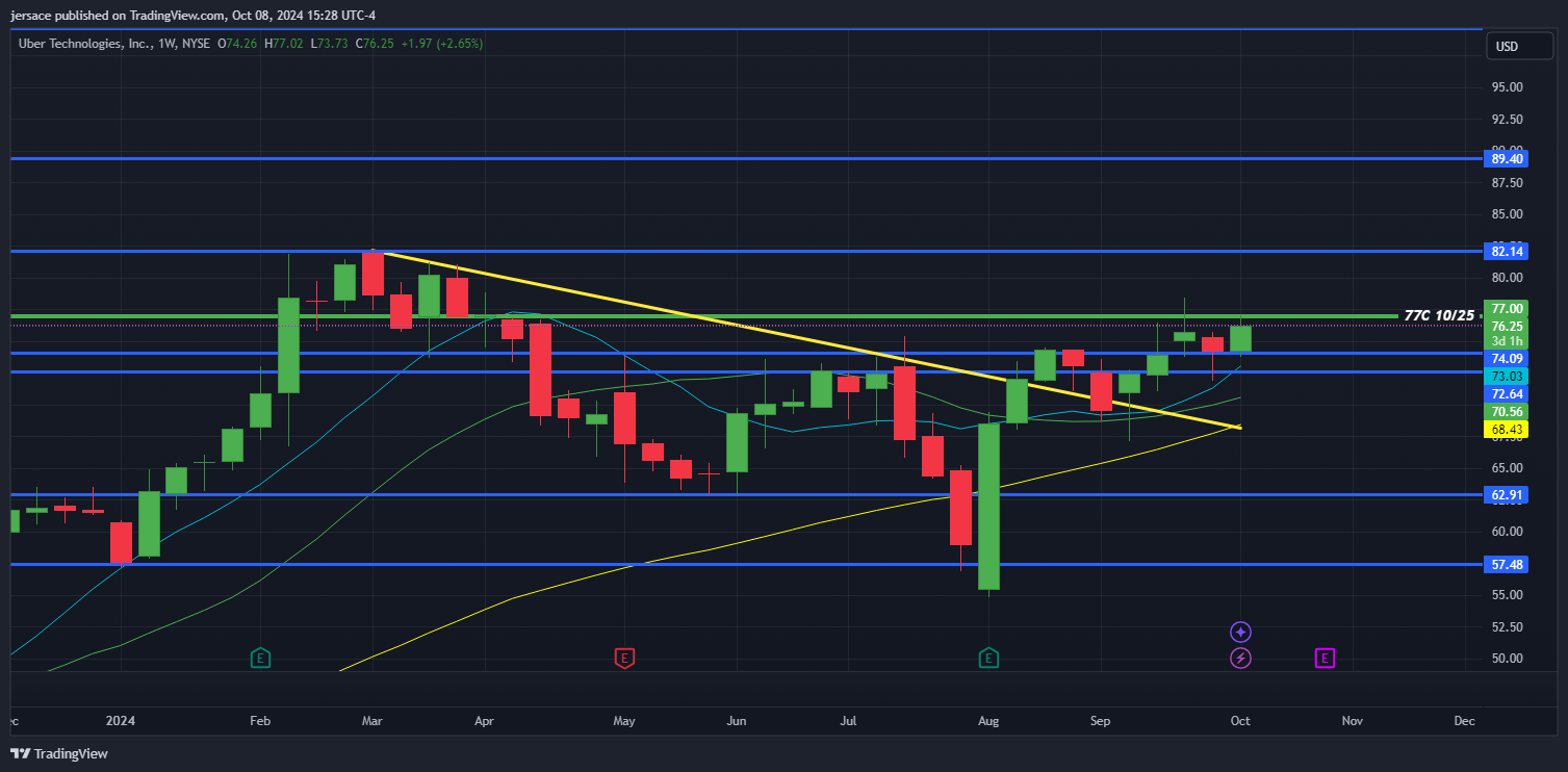 UBER has seen a ton of boost from the popular AI theme the last few months as they gather more and more news from companies such as Tesla in regards to FSD and other AI compatibilities. Short term expiration on this trade makes it riskier than others, but also makes the reward much more exponential as you all know as well. This does not cover their upcoming earnings, however it is less than a percent OTM so it doesn’t take much for this trade to be profitable / ITM.