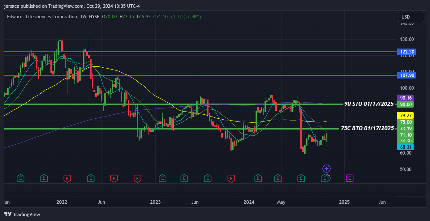 EW is a leader in artificial heart valves and “hemodynamic monitoring”, presents an intriguing opportunity for a reversal strategy into January. The company's strong position in the growing TAVR market, recent positive trial data, and analyst upgrades support a potentially optimistic outlook. With upcoming earnings on January 30, 2025, and the stock currently trading below the average analyst target of $74.59, EW could see upward momentum. The chart itself doesn’t exactly have the sexiest appeal to traders although, it does seem to have found a base making higher highs and holding lows after a significant drop-off a couple months back. Traders will seek to reclaim the 20wk-MA and remain below the price of 90 for optimal returns on this strategy.