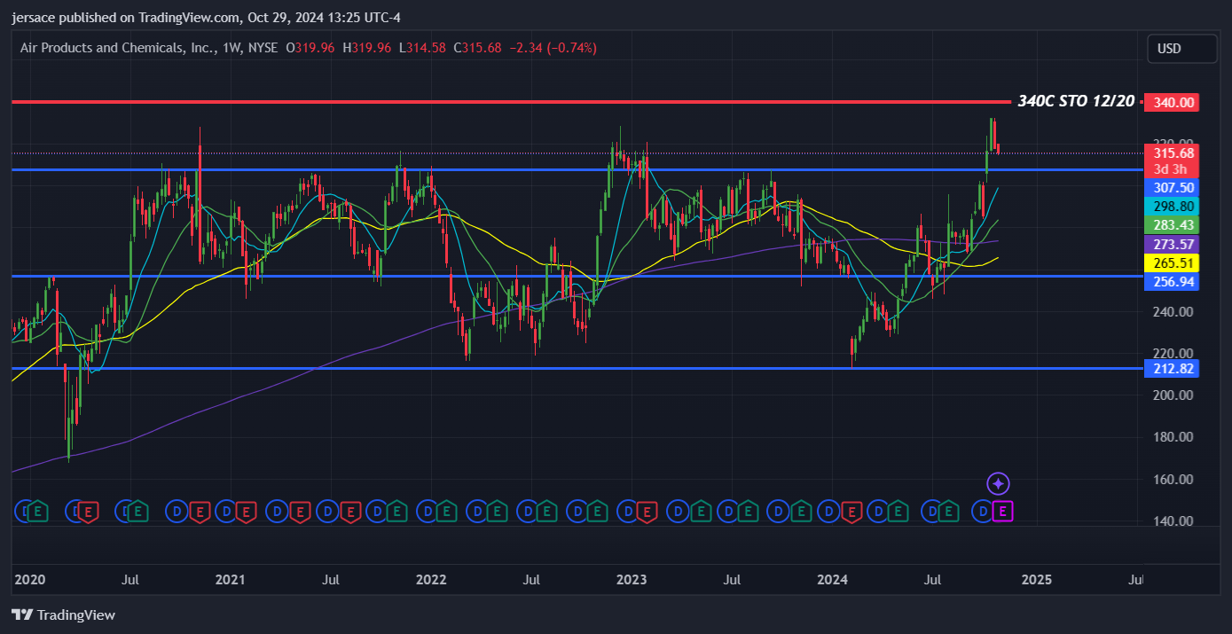APD's stock has underperformed year-to-date, down by 17%, and has decreased by 9.4% over the past month. This downward trend suggests investor sentiment may be negative. Analysts predict a drop in current quarter sales by -6.20%. The stock has recently rejected prices above the previous range and continued the rejection today with an outside day with a lower low triggering further downside in days ahead. Also being as extended as it is from the nearest moving average’s, it certainly has some correcting to be done considering the recent rally.