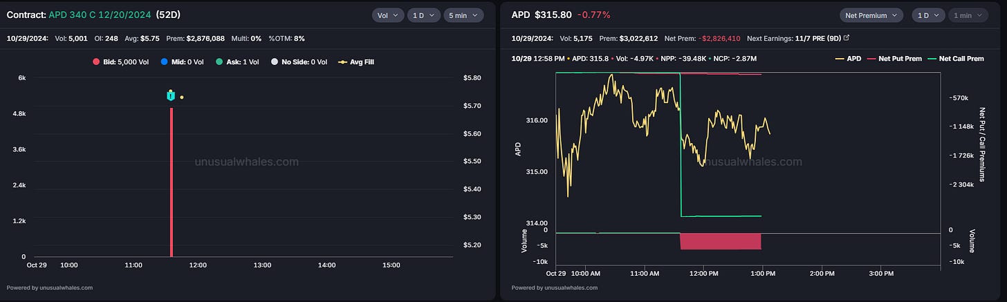 This floor trader is placing a bearish bet on the stock by selling 5k contracts of these calls on credit, receiving almost $3 million. The trader speculates that the stock price will remain below $340 by expiration. If the contracts expire OTM, they will be worthless, and the trader can collect the premium and keep it for profits when the trade is closed.