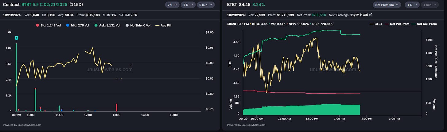 Another crypto name that has had an amazing month is up almost 60% from its October lows. Whales still believe in more upside by adding the 5.5C with 115 days to expiration. The call net premium reached $730k today, the highest amount in the past 30 days.