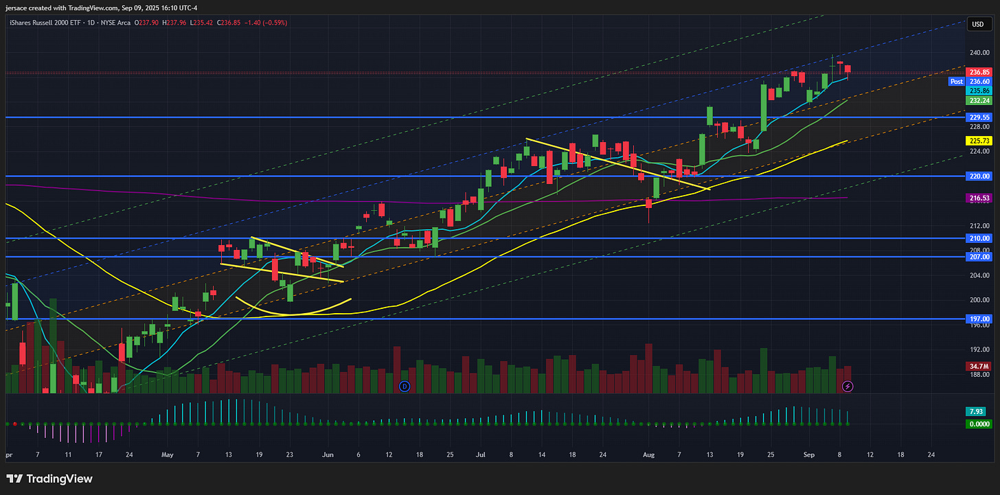 IWM is trading around $236.75, down just under –0.6% on the day as small-cap sentiment cools a bit. What’s fueling this? Small caps got a real shot in the arm in August, rallying nearly 8% on the Russell 2000, massively outpacing S&P’s ~3% gain. A lot of dry powder piled in thanks to dovish Fed vibes and a rotation back into financials and cyclicals. Consensus remains rate cuts in September, but only time will tell.