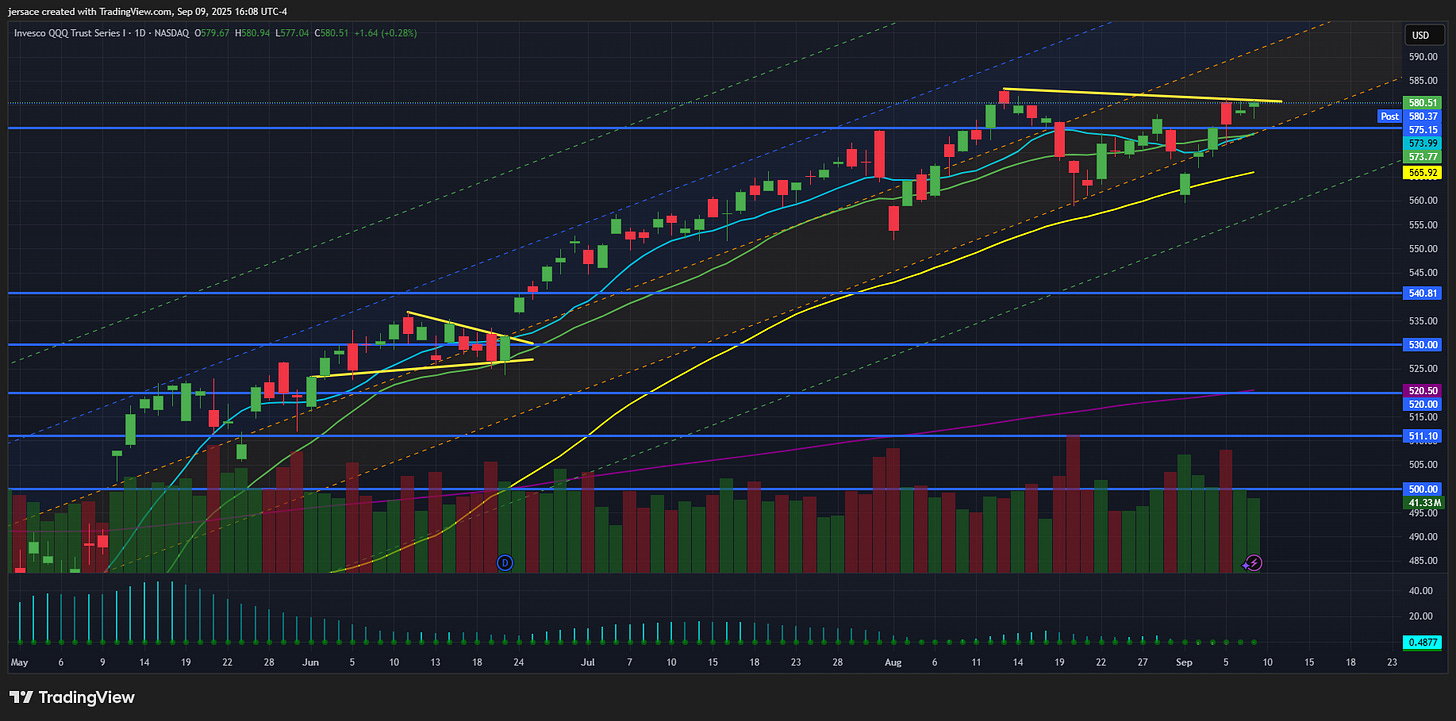 QQQ is hanging right around $580, up about +0.28% on the day. Pretty clean action considering we’re inching closer to key macro data later this week. On the bigger picture, QQQ’s still one of the strongest tapes out there, up ~13% YTD, which has it running ahead of SPY. Even this past week it’s stacked another +3% as big tech continues to carry the load.