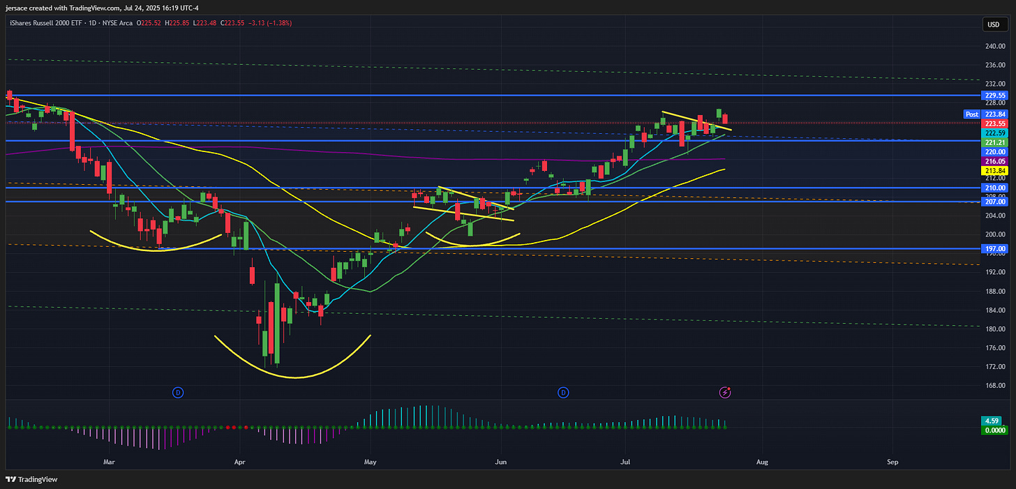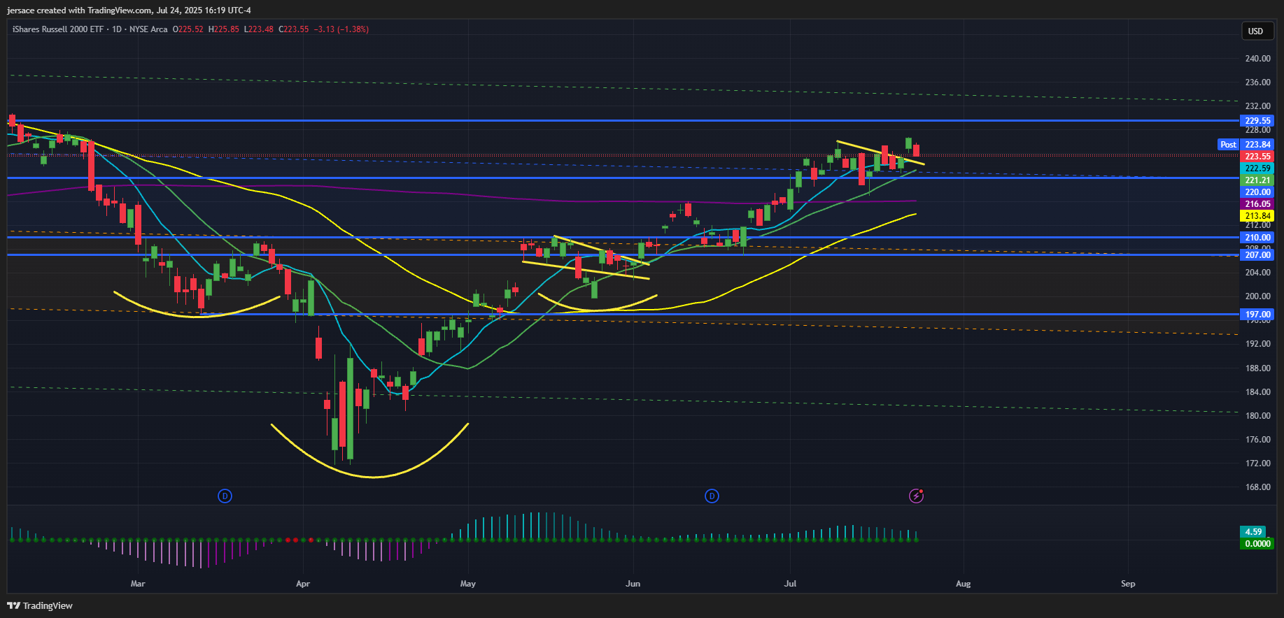 Similar story here with the Q’s riding the 10 & 20D SMA’s nearly the entire way up. Tech continues to lead with thematic bids across Semiconductors, AI, & Cloud services. Support remains nearby and the upper STD range has been breached. Uptrend momentum is solid but falling volume with higher prices could signal short-term exhaustion. Brief consolidations / rotation would be beneficial here.