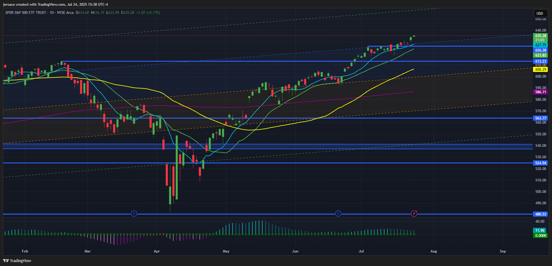 The major indices remain resilient with SPY and QQQ pushing to new highs and IWM catching up as market breadth improves. Upside remains favored.
