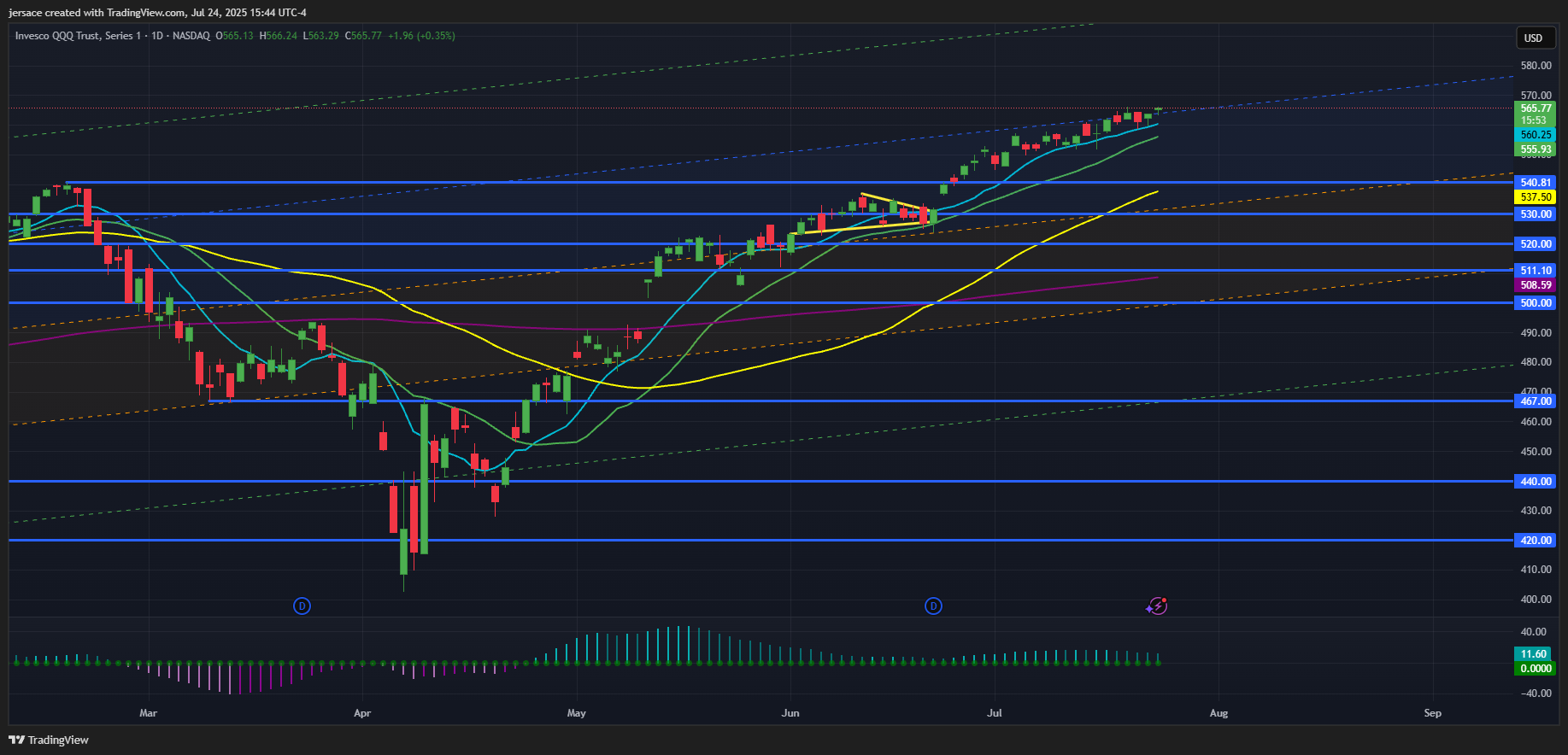 Having logged a new all time high, with an unrelenting uptrend extending through the summer, SPY currently sits well above key moving averages confirming strong momentum. Buying pressure continues to persist despite lighter volume + better overall breadth suggesting participation beyond the megacap assets. Outside of your moving averages acting as support, I’ve marked a few as well. Sentiment remains bullish yet it would not surprise me to see some profit-taking or some pullbacks along the way as we’ve had a tremendous rally from April lows.