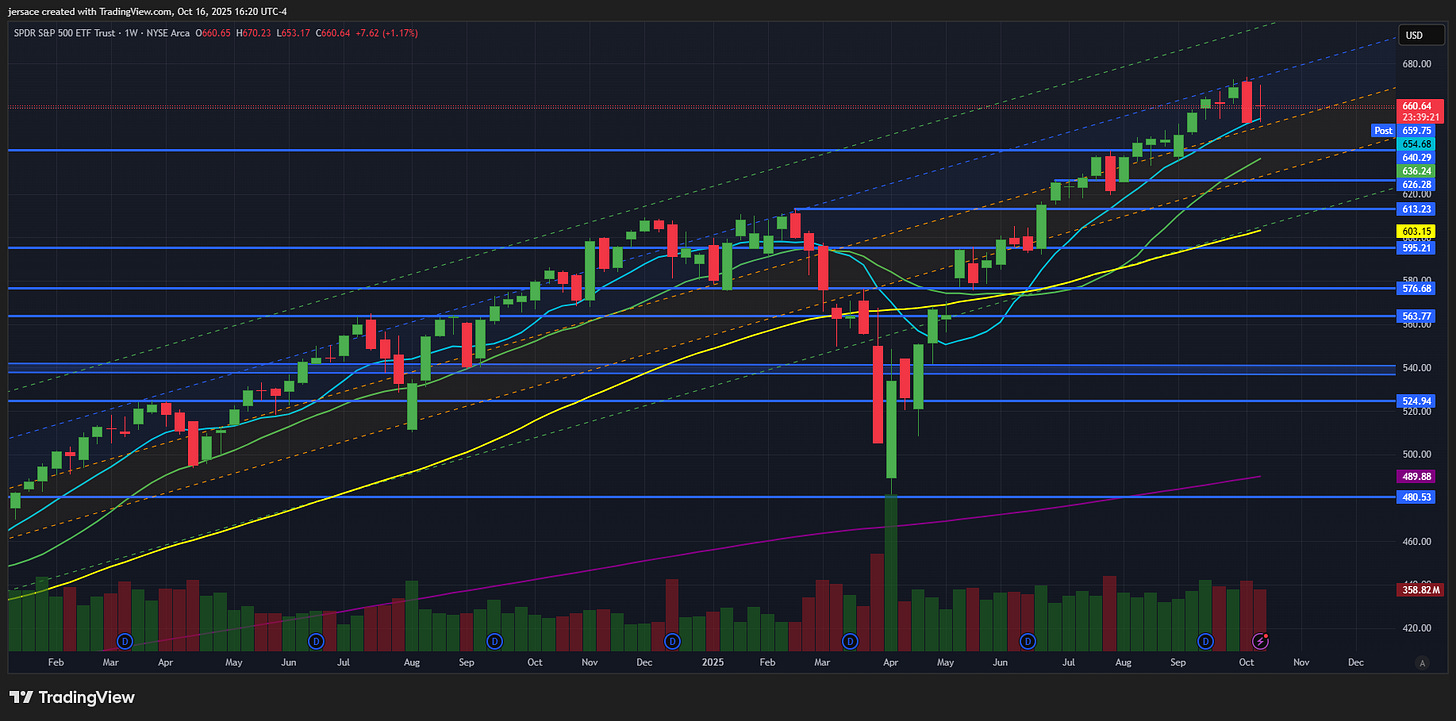 Yes we are below the 10 / 20D SMA’s… However, SPY’s dancing in that resistance band just above its recent highs. The strength is there when buyers show up, but the follow-through’s been weak. It’s stuck in a range until volume backs a clean breakout. If price can reclaim and hold above that resistance zone with conviction, we may see a leg higher - but if not, this could rollover. It’s a classic “watch the edges” game right now. While we are below the easy momentum average’s of 10/20D, we’ve maintained the 10wk to this point and are already reaching extreme fear territory on the fear/greed index ticking to 20.