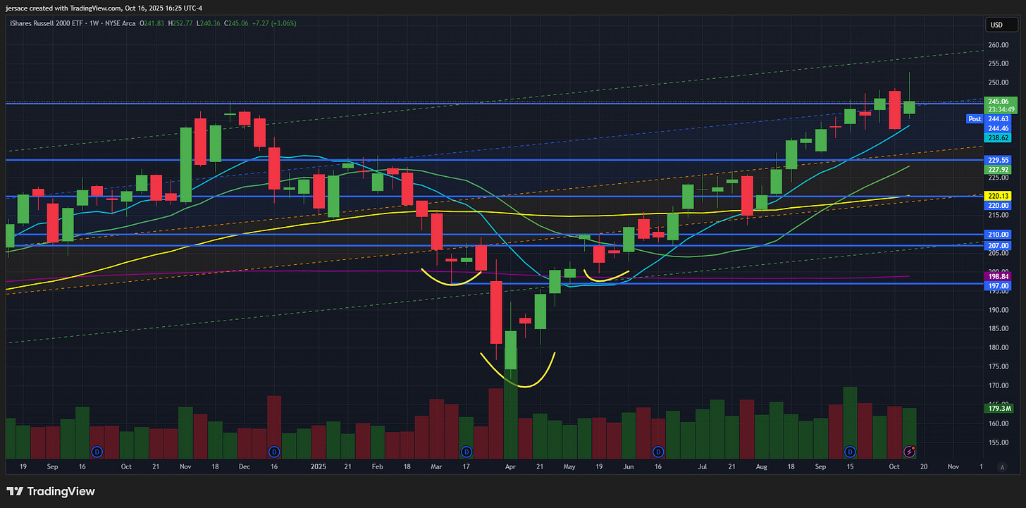 Small caps continue to lag the party. IWM’s showing more volatility - it will move quick when liquidity or macro relief hits, but until then it’s getting clipped on weakness more often. The chart is weaker, participation is sparser, and without a catalyst, IWM will be reactive, not leading. If macro or policy surprises line up, though, it could be a sharp catch-up… which is what many have practically begged for now for the last four years. As it stands now is actually pretty important in regards to the weekly candle close. We’ve only closed above this 244.59 level shown once in the past four years (two weeks ago) before ultimately failing the breakout. IWM actually still holds the 20D SMA still but in a way a moot point given the lack of returns here.