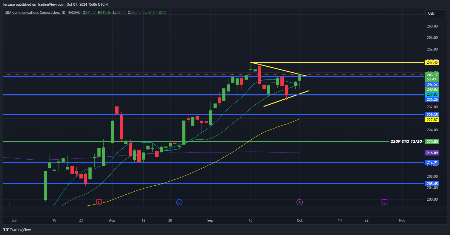 A major player in the wireless communications infrastructure sector, operates as a Real Estate Investment Trust (REIT) focused on leasing antenna space on its towers to wireless carriers. SBAC also shows a bullish pennant on the daily chart with good support from recent resistance levels shown at 236 and change. Supportive moving average’s as well. This whale will likely be looking for a break of this pennant for continued upside with these levels noted as support for potential loose stops.
